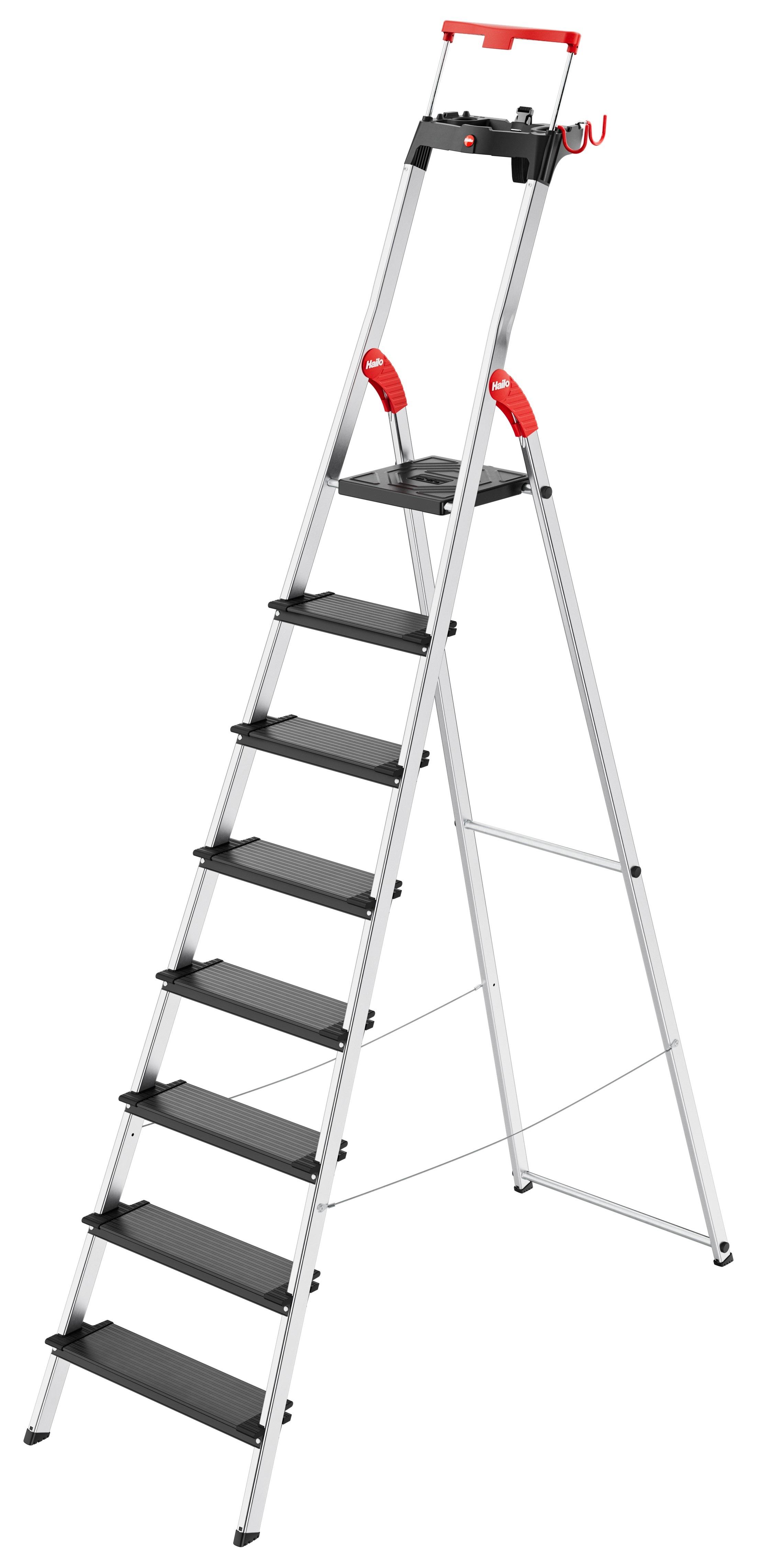 Hliníkové bezpečnostní schůdky s multifunkční přihrádkou, bezpečnostním držadlem a zajištěním plošiny nabízí bezpečnost ve formátu XXL: 130 mm extra hluboké nášlapy.